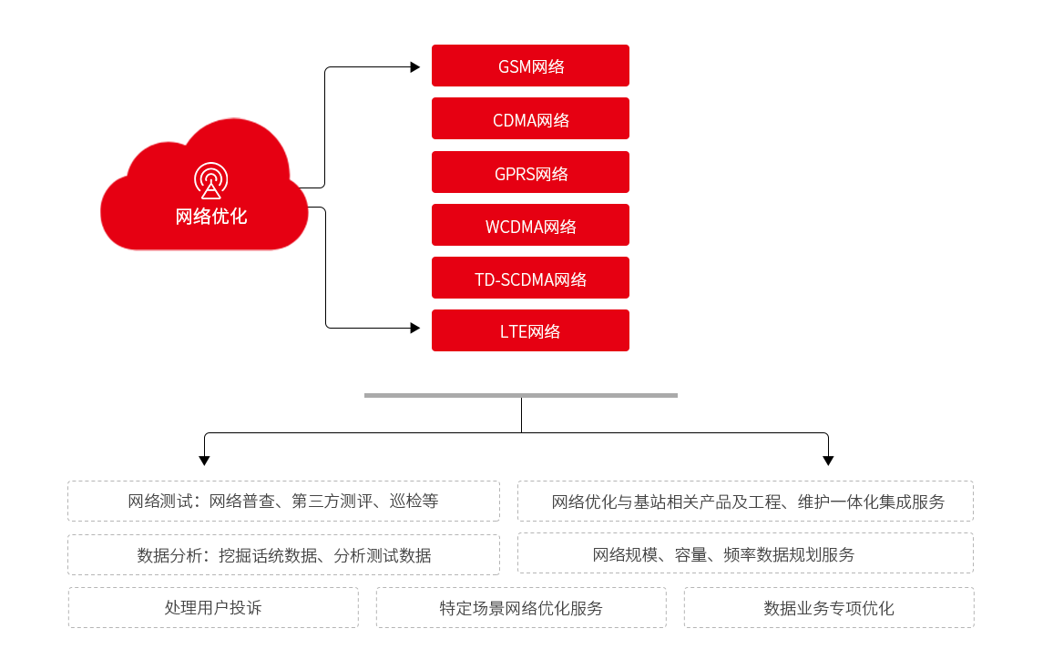 公司具有專業(yè)的網(wǎng)絡(luò)優(yōu)化分析團(tuán)隊,具備多廠家、多運(yùn)營商的綜合性網(wǎng)絡(luò)優(yōu)化能力,針對GSM、CDMA、TD-SCOMA、WCDMA、LTE等多種制式的無線網(wǎng)絡(luò),提供整體的優(yōu)化解決方案,包括建網(wǎng)初期相后期擴(kuò)容工程的工程網(wǎng)絡(luò)優(yōu)化服務(wù)、運(yùn)維期間的日常網(wǎng)絡(luò)優(yōu)化服務(wù)、階段性分析解決網(wǎng)絡(luò)瓶頸的專項網(wǎng)絡(luò)優(yōu)化服務(wù),通過測試數(shù)據(jù)分析、話統(tǒng)數(shù)據(jù)分析,結(jié)合天饋線系統(tǒng)優(yōu)化、無線參數(shù)優(yōu)化話務(wù)均衡等方式,對網(wǎng)絡(luò)性能指標(biāo)進(jìn)行優(yōu)化提升,最終達(dá)到提高網(wǎng)絡(luò)質(zhì)量以滿足終端用戶需求及提升網(wǎng)絡(luò)設(shè)備利用率的效果。